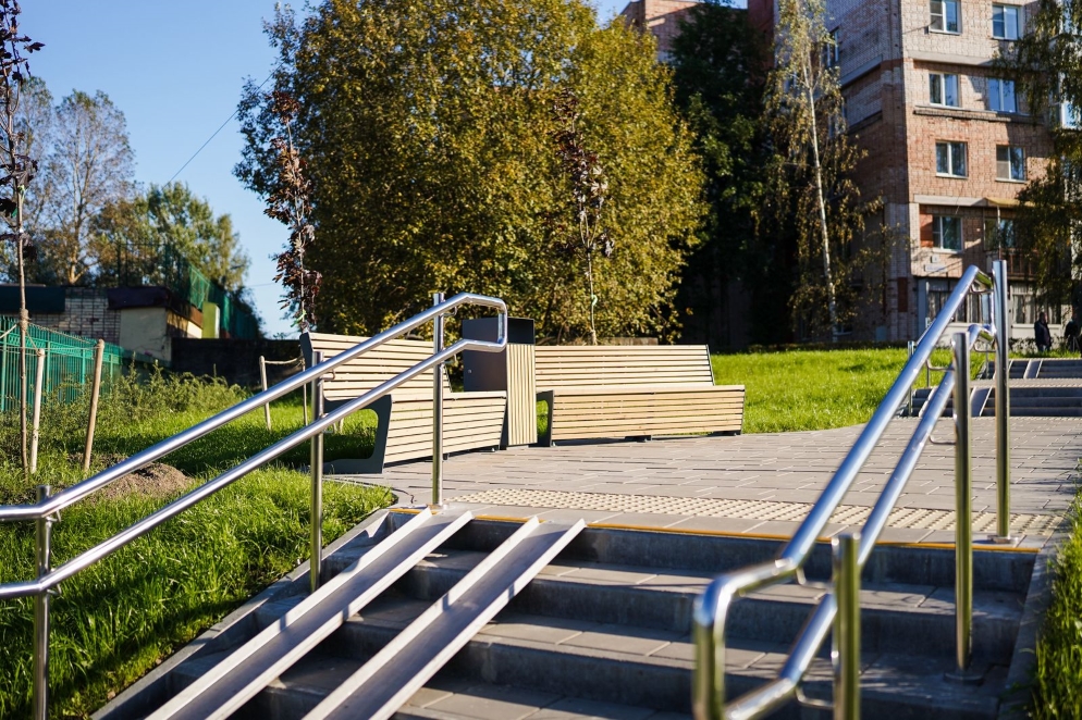 Сквер на улице Победы в Ломоносове стал современным зелёным пространством с экотропами, зоной отдыха и освещением. Спуск на улице Жоры Антоненко в посёлке Мартышкино оборудован лестницами с поручнями, тактильными плитами и дорожкой, удобной для пожилых людей, мам с колясками и маломобильных горожан.